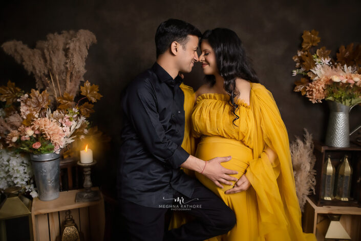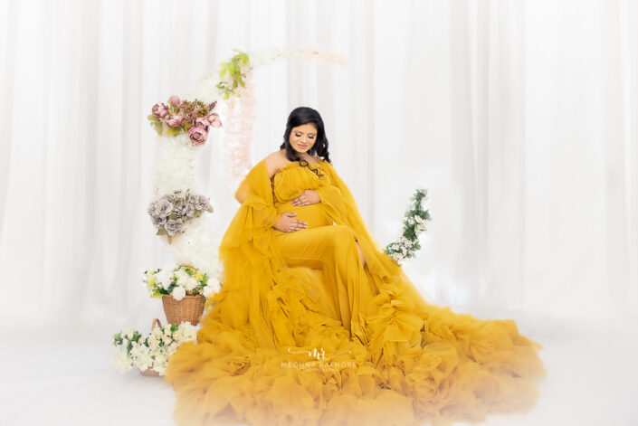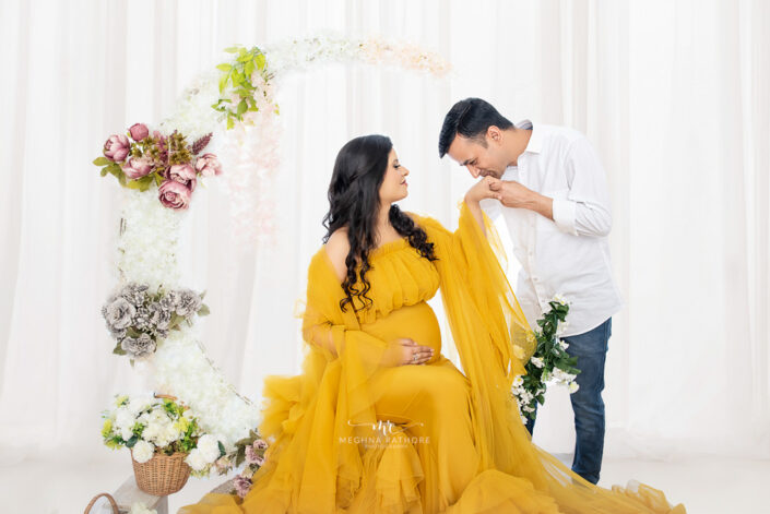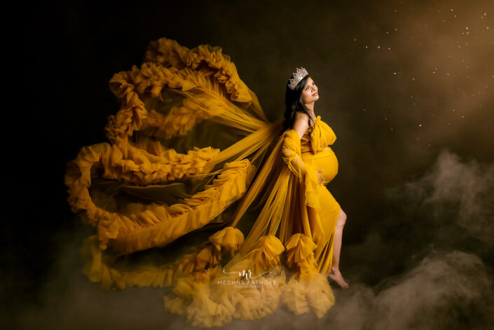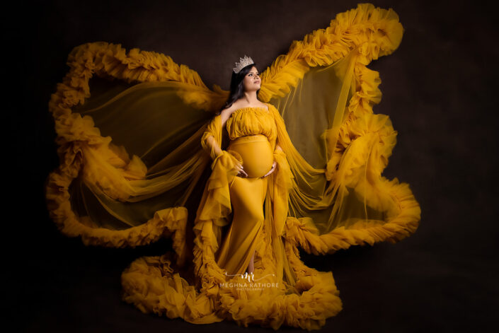 Maternity Gallery – Beautiful Maternity Photoshoot Wearing Mustard and Pink Gowns in Gurugram By Meghna Rathore Photography