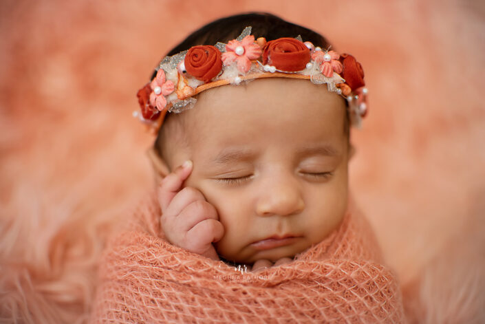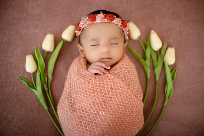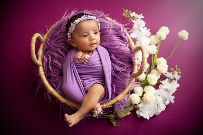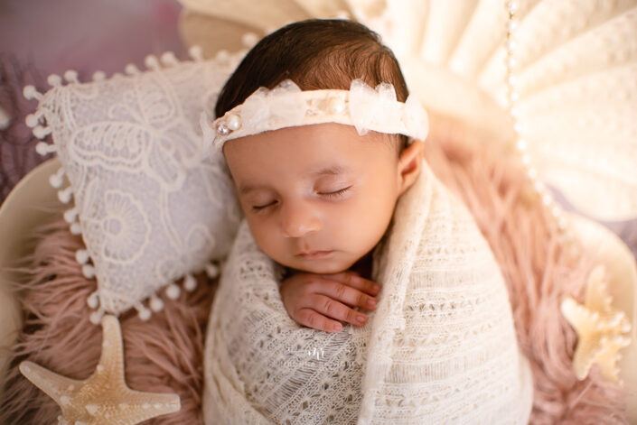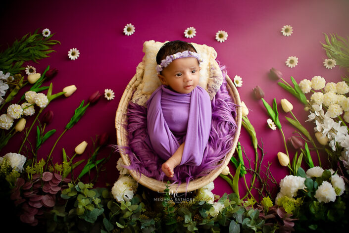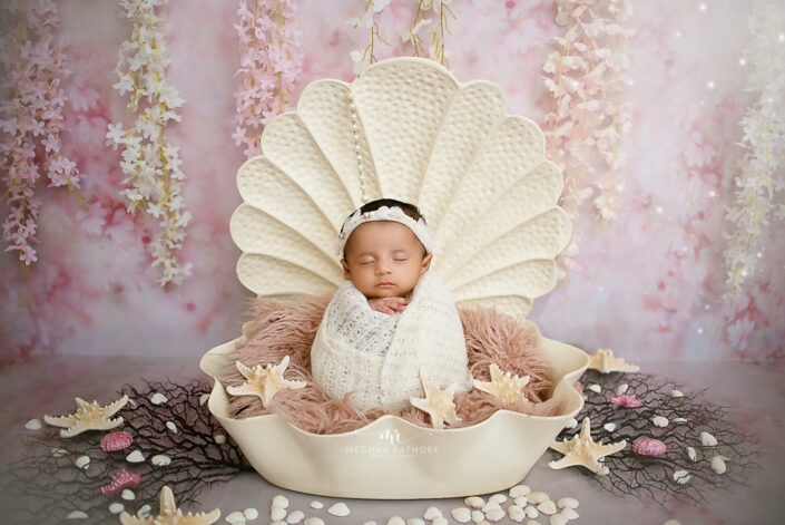 Newborn Photoshoot – 50 Days Baby Girl Photoshoot with Pearl Shell, Potato sac, Swing with Flower Theme