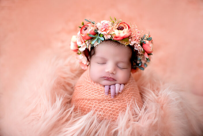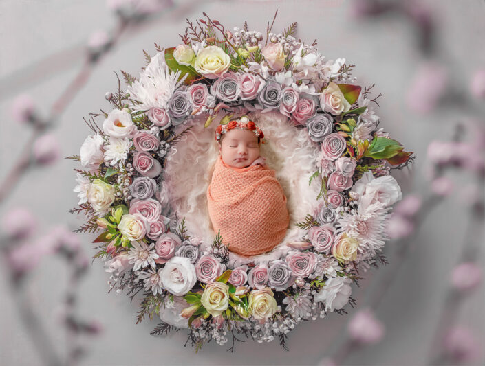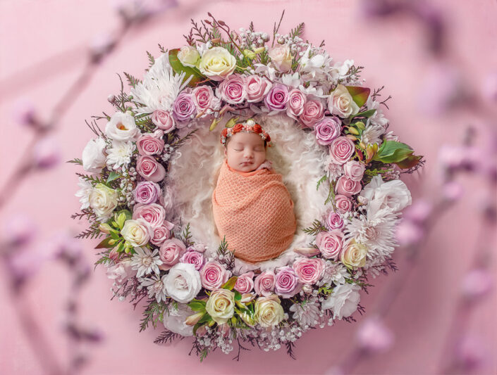 Baby Album – 5 Months Baby Girl Photoshoot in Barbie Theme, Portrait using various floral colors.