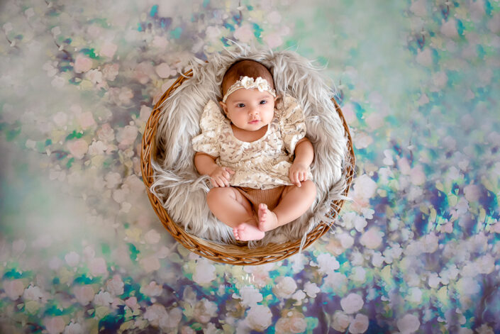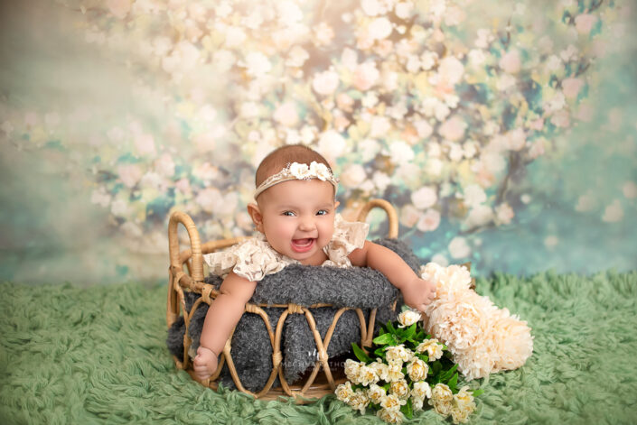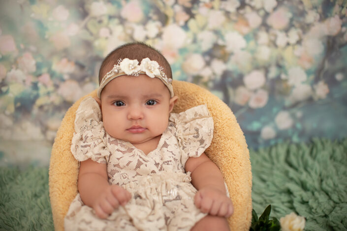 Baby Album – 5 Months Baby Girl Photoshoot in Barbie Theme, Portrait using various floral colors.