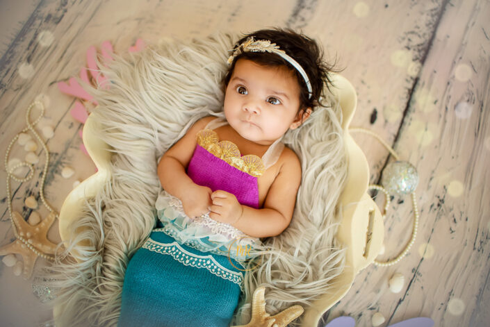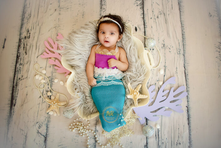 Baby Gallery – 3 Months Baby Girl Photoshoot Using Mermaid, Vintage Greens, Maroons and Blue Florals