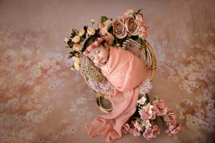 Baby Album – 5 Months Baby Girl Photoshoot in Barbie Theme, Portrait using various floral colors.