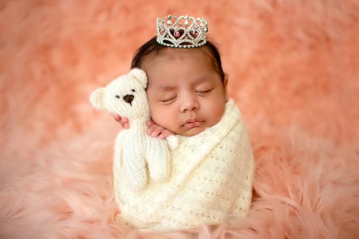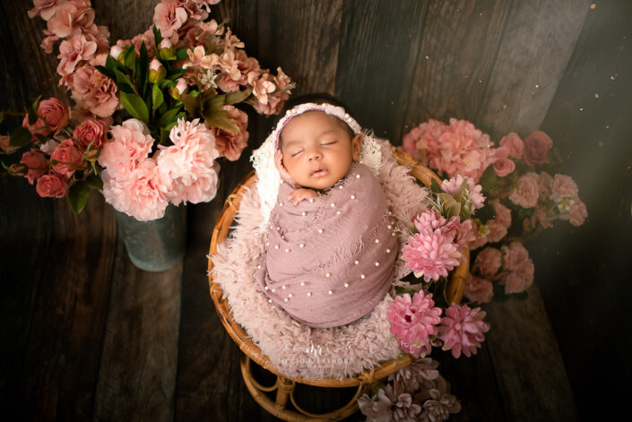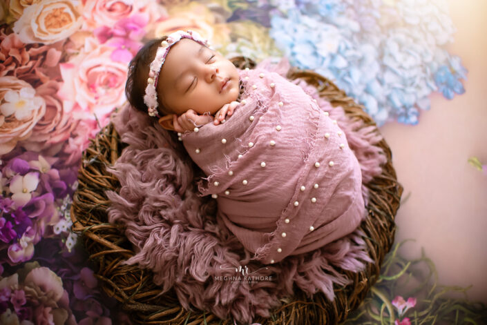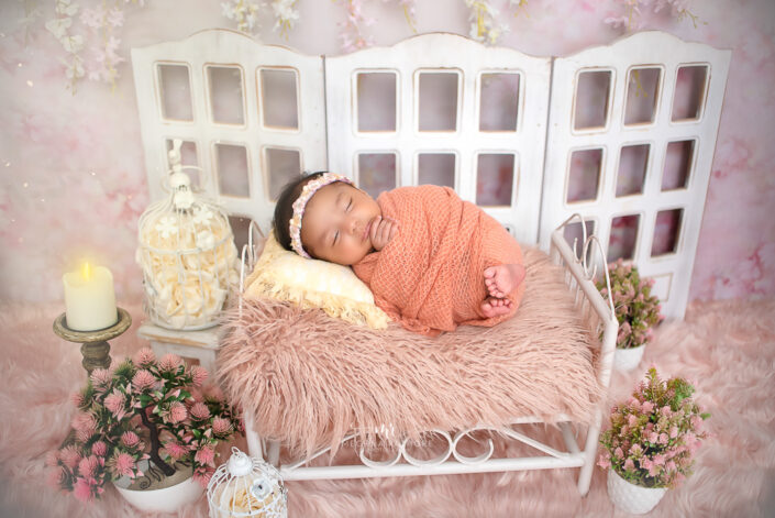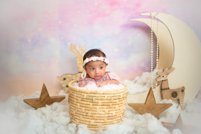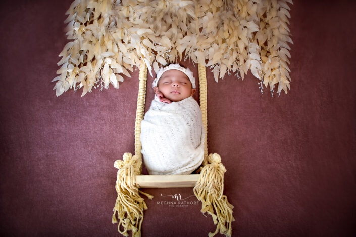 Newborn Photoshoot – 45 Days Baby Girl Photoshoot With Bed, Swing and Moon