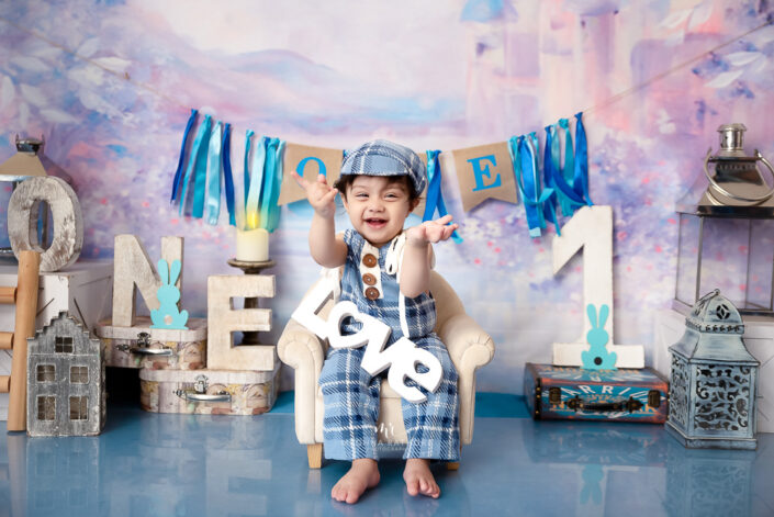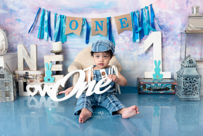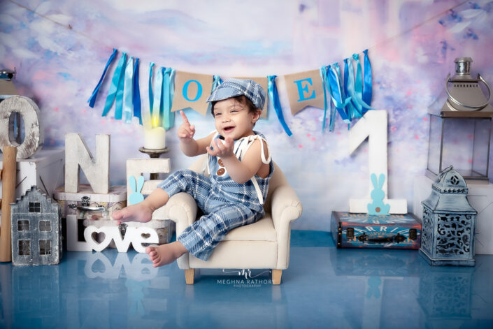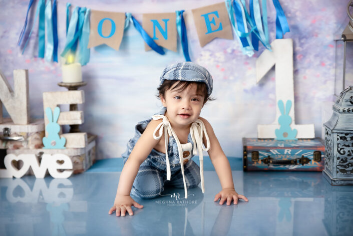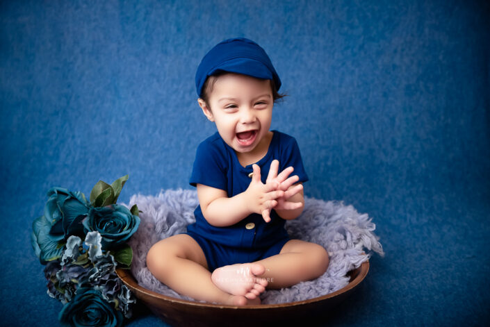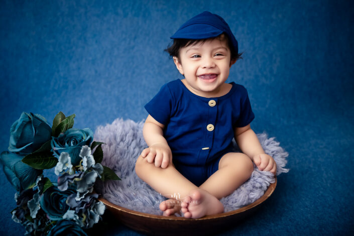 Baby Album – 5 Months Baby Boy Photoshoot in Travel, Vintage Themes with Many Floral Setups in Yellow and Blue along with Family Portraits
